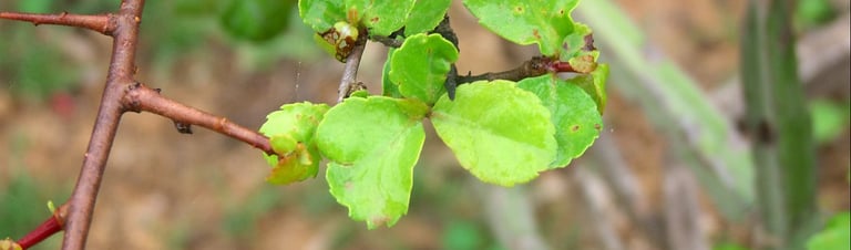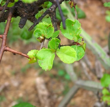 The myrrh tree is distinctive due to its white flowers and knotted trunk. Because it grows in arid desert conditions, it often has very few leaves and can take on an unusual, twisted shape due to harsh weather and wind.